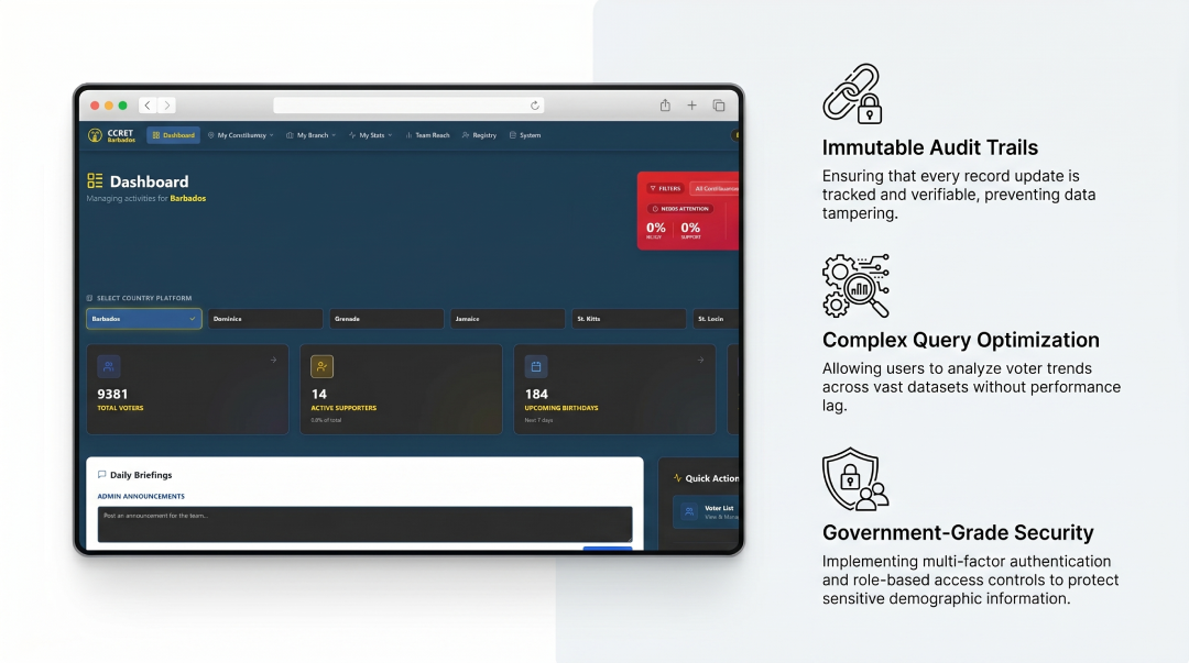 When dealing with national voter records, the margin for error is zero. CCRET required a platform that could store, analyze, and visualize complex political data with absolute integrity and transparency.